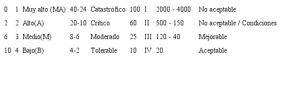 En [12], se explica que la técnica presenta ausencia de valores absolutos de riesgo, probabilidad y consecuencias, debido a ello, se maneja el vocablo “nivel de riesgo (NR)” en una escala de cuatro posibilidades, a saber: No aceptable, No aceptable con condición, Mejorable y Aceptable. Por tanto, se determina el "nivel de riesgo", "nivel de probabilidad" y "nivel de consecuencias". El nivel de riesgo (NR) se determina en función del nivel de probabilidad (NP) y del nivel de consecuencias (NC) y puede formularse como: