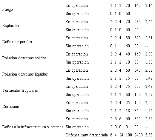 En cuanto al análisis de riesgos, se produjeron los resultados mostrados en la quinta columna del Cuadro VII, en la que destaca el riesgo “daños a la infraestructura y equipos”, cuyo escenario: “defensas con cono flexible muy deterioradas” arrojó un nivel de riesgo intolerable, lo cual se infiere que representaría para la organización un tratamiento acorde al nivel declarado en la evaluación.