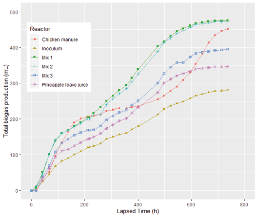 Results also show that between 400 and 600 hours, samples containing pineapple leave juice achieve a faster hydrolysis. These results are to be expected since according to [48], bromelain enzymes are present in all parts of the pineapple including the stem, crown leaves and true leaves. Bromelain is a protease which hydrolyzes proteins present in the juice and, in a higher proportion, in the chicken manure [49]. Since chicken manure protein content in relatively high, mixes 1 and 2 with a higher chicken manure concentration, provide a higher biogas yield.