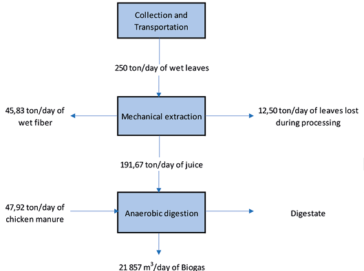 he leaves are collected and transported to the processing plant, where the juice is extracted mechanically. Chicken manure is also collected and transported to the processing plant. A mixed feed of juice and chicken manure enters the reactor for the codigestion process. The feed basis for the study was 250 tons of leaves per day (corresponding to 730 hectares farm). The anaerobic digestion reactor operates at 37 °C, with continuous stirring at 110 rpm, for a hydraulic retention time of 15 days.