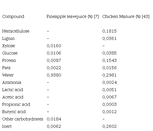 Previous studies show that pineapple production waste, including peel, cores, pulp, and leaves, can have the technical potential to generate biogas in a feasible process. During the study of the production of biogas in a plug flow reactor using pineapple pulp and peel, [35] determined that the increase of the concentration of pineapple by-products in the feed from 2 % at a hydraulic retention time of 7 days to 4 % at a hydraulic retention time of 10 days doubled the biogas production rate, which could be increased up to 52 % more by recirculating the fermentation effluent at 40 % (v/v). [36] determined that pineapple peel and core codigestion with cow manure resulted in the production of a biogas with more than 60 % methane. This study revealed that a mix proportion of 1:1,5 (manure:fruit waste) yielded a higher methane content and reduced the hydraulic retention time by 5 days [36]. In the case of liquid by-products, [37] found that the anaerobic digestion of squeezed pineapple liquid wastes (extracted from solid wastes) in a hybrid reactor yielded up to 0,504 L/gCOD of biogas with 0,277 L/gCOD of methane. This study aims to implement an anaerobic digestion process able to treat pineapple waste in the North and Atlantic region of Costa Rica, in combination with chicken manure, to provide a feasible solution to farmers while high value-added products are generated. Anaerobic codigestion of pineapple leaves juice with chicken manure could result in an increase on methane production and a decrease in hydraulic retention time, compared to each substrate digested on its own [36], [38].
