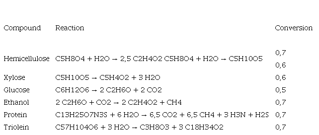 The acidogenic, acetogenic and methanogenic reactions are presented in TABLE III. Fractional conversions were assumed to adjust the biogas product as close as possible to the experimental yield. All thermodynamic properties were calculated with the NRTL model, adjusting missing parameters with UNIFAC model.