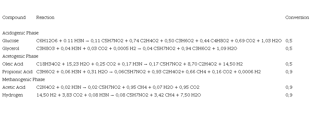The anaerobic digestion reactor was simulated as a stoichiometric reactor, with a hydraulic retention time of 15 days. The hydrolytic reactions were included according to the method presented by [44], and the reactions adjusted to the components present in the system (TABLE II).