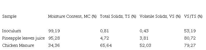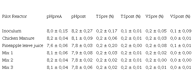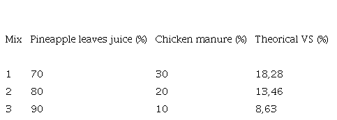 Chicken manure was added to generate 3 substrate mixes as shown in TABLE V. Due to its high content on total solids, this addition resulted in an increment on the VS concentration, compared to the original substrate (100 % pineapple leaves juice). On TABLE VI is presented the pre-digestion and post-digestion characterization of the BMP reactors.