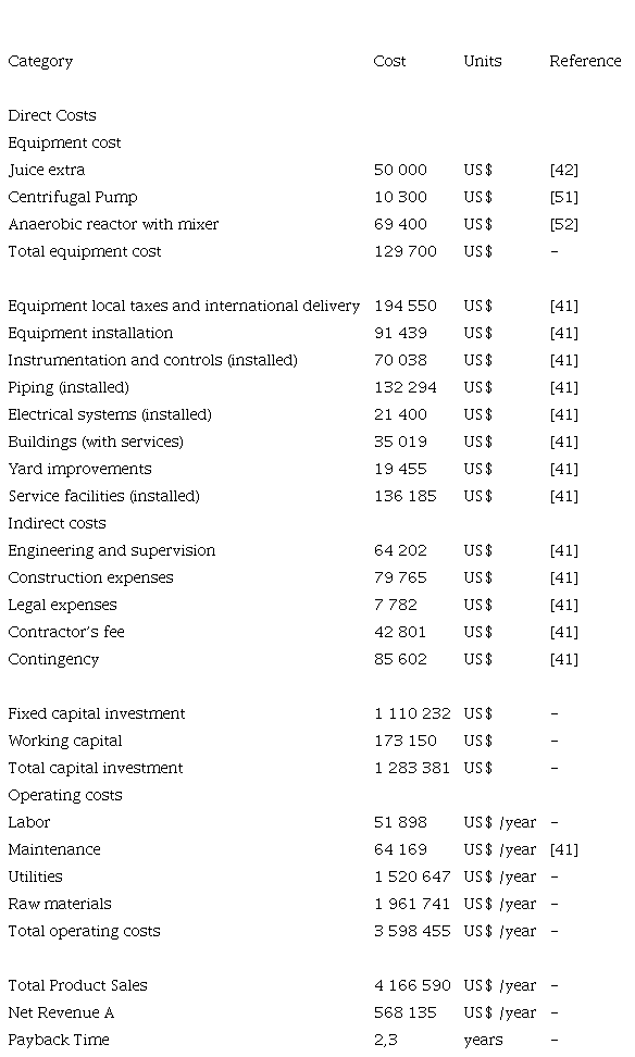 of this waste management process. The economic evaluation results, shown in TABLE VII, give a CapEx of US$ 1 283 382 for the implementation of the processing plant. This is a relatively low investment, considering that the OpEx is US$ 3 598 455, which includes raw materials, electricity, maintenance, and labor. Considering that a very large amount of biomass must be collected and transported, raw materials cost is a significant contribution in the production cost. However, another high contribution to the operation costs is utilities, which is to be expected since mechanical extraction of the juice is an energy-intensive process [42]. For these results, the equipment cost considers an anaerobic reactor, with a heating system and stirring mechanism, the juice extractor and a centrifugal pump.