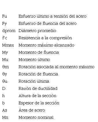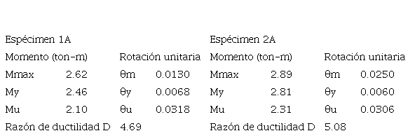 En el CUADRO I, se presenta un resumen de los resultados obtenidos para los especímenes 1A y 2A. Se pueden observar los puntos que forman las curvas elastoplásticas, así como las razones de ductilidad obtenidas.