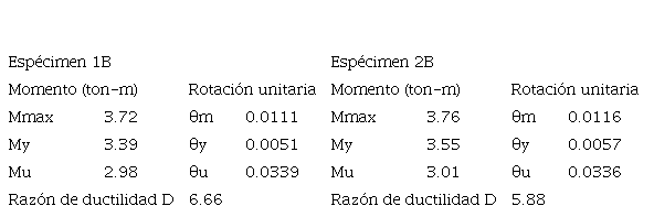 En el CUADRO II, se muestran las rotaciones y razones de ductilidad obtenidas para ambos especímenes Tipo B. Se obtuvieron momentos últimos similares, así como rotaciones de fluencia de orden de magnitud similar, con una diferencia de 0.78 en las razones de ductilidad. Ambos especímenes se consideraron para el cálculo del promedio de capacidades de las uniones Tipo B.