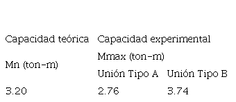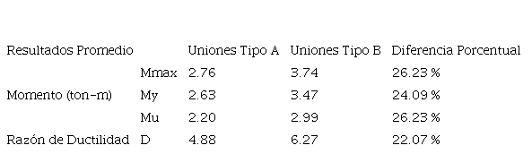 Según lo analizado anteriormente, se calcularon los resultados promedio entre las uniones Tipo A y las uniones Tipo B. Estos resultados se presentan en el CUADRO III, donde se observa que la diferencia porcentual entre las razones de ductilidad de ambos tipos de unión corresponde a un 22.07 %. Además, el momento de fluencia de ambos tipos de unión difiere en un 24.06 %.