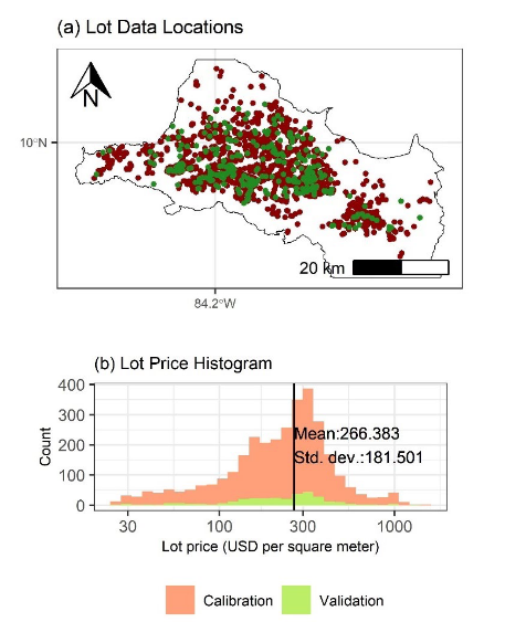 In general, the analysis of land value in the San José metropolitan region (GAM) has been fragmentary [1]. Recent efforts from extension and research projects at the University of Costa Rica, however, have yielded a data set of real estate listings that provided the first synoptic view of real estate prices in the region [3]. Based on this data, hedonic price models of housing have been produced [3,4] and the first efforts at extrapolation of land values for the entire region (based on kriging and co-kriging) were developed [1]. To isolate land values, [1] consider in their analysis only lots —i.e., properties offered in the land market with no buildings on them and, therefore, with prices only reflecting the attributes of land—; these initial efforts yielded estimates of mean values and of variance, but they were limited to the kriging and co-kriging models.