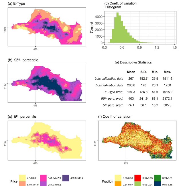 The second relevant finding of Fig. 2 corresponds to the interpretation of panels (a), (b), and (c): in effect, the E-Type prediction (of panel (a)) is the best estimate of land value; panels (b) and (c) represent higher and lower bound values for this prediction: the land value for 90 % of simulated instances was estimated to lie within the range for each location. An examination of this more detailed set of maps suggests uncertainties may be larger than what the overall measures (of validation, discussed and reported in TABLE I, and of the coefficient of variation) had suggested. By comparing location-wise, for most locations, the upper (95th percentile) or lower bound (5th percentile) shift one category. Given the values involved, this represents around double the back-transformed mean value.