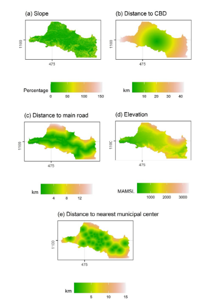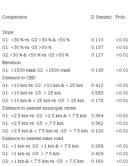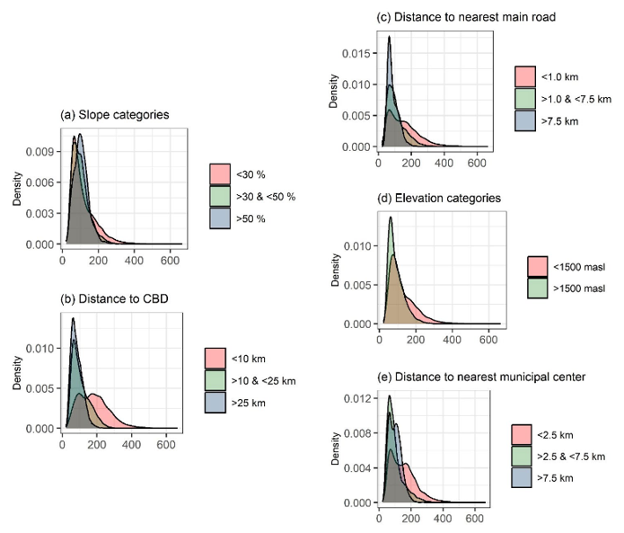 The second objective of this paper, following the estimation of uncertainties, is to explore if these uncertainties respond to regularities in space. To do so, five factors that determine suitability for urban development (and, in consequence, are related to land price formation in urban markets) were considered: slope and elevation, and (Euclidean) distance to the CBD, to the nearest municipal center and to the nearest main road. For each factor, three groups of locations were created (except for elevation, for which only two groups were defined) based on the factor value; group intervals were generally defined based on the variable histograms, although for slope, the group limits are related to statutory building requirements.