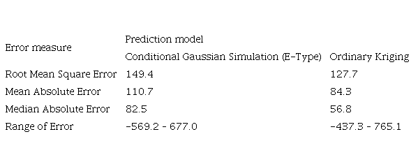It is further worth noting that the literature has detected over-smoothing problems associated with deterministic methods such as ordinary kriging that can be overcome with simulation. The current focus of this study was not the comparison of conditional Gaussian simulation with other extrapolation predictions; however, this is regarded as a potential area for further investigation.