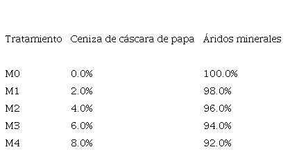 La cáscara de papa recolectada se lleva al horno para ser calcinada y, al retirarse, se observa que este elemento orgánico se reduce en comparación con su peso inicial en un 30.0 % y se adiciona directamente sobre la mezcla asfáltica en caliente, según los porcentajes especificados, en la muestra control compuesta inicialmente con 42.60 % de piedra chanca ¾” y arena zarandeada 1/4” de la cantera Pichipampa; 23.20 % de arena chancada ¼” proveniente de la cantera Higueras; 5.80% de cemento asfáltico (PEN 85-100); 2.0 % de cal hidratada y 0.40 % de agregado mejorador de adherencia Quimibond 3000.