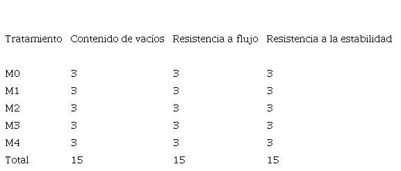 Donde yij es el parámetro de la mezcla asfáltica en caliente de la repetición j-ésima del i-ésimo tratamiento, μ es el efecto constante, τi es el efecto del tratamiento en el parámetro (adición de 2.0 %, 4.0 %, 6.0 % y 8.0 % de ceniza de cáscara de papa) y εij corresponde a la afectación de variables aleatorias (cuya magnitud se considera mínima).