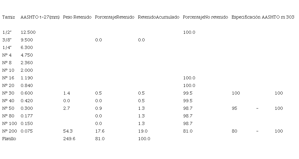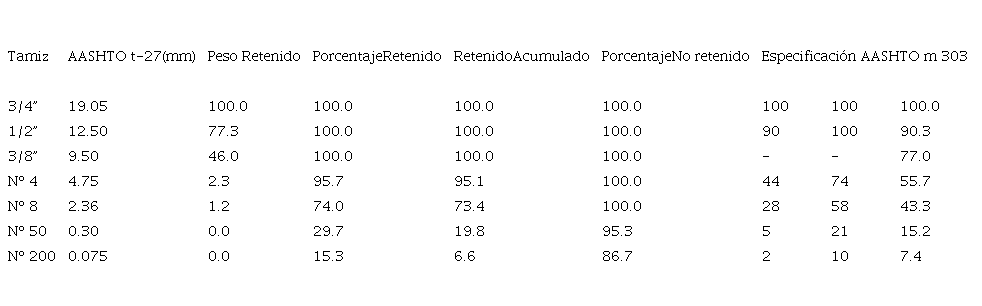 En el CUADROS III y IV, se presenta el análisis granulométrico de los agregados minerales, confirmándose que los materiales pasan el tamiz ¾” y de la ceniza pasan la malla Nº 30, lo cual satisface lo requerido en la norma AASHTON M303, los resultados obtenidos se grafica una curva granulométrica demostrando que cumplen lo exigido en la norma, tal como se aprecia en la Fig. 5.