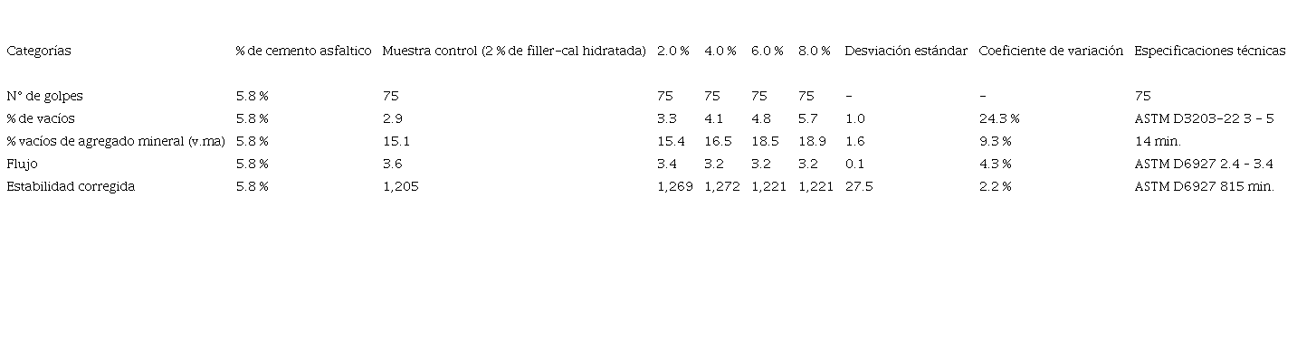 Los resultados anteriores se encuentran acordes con los obtenidos por [14], donde se determinó que la adición de 5.0 % de cenizas de paja de arroz en la mezcla asfáltica produjo una mejora en el contenido de vacío al registrarse un 3.93 %, mientras que en el trabajo realizado por [15], en el que se adicionó un 5.0 % de ceniza de cáscara de arroz en el asfalto se obtuvo una mejora de 1.22 % en el contenido de vacío. En lo que respecta a antecedentes internacionales, este resultado se corresponde con los alcanzados por [20], en el que evaluó la incidencia de una adición del 50.0 % de cenizas de cáscara de arroz en el desempeño de las propiedades de la mezcla asfáltica, encontrando una mejora del contenido de vacío de 4.1 %.