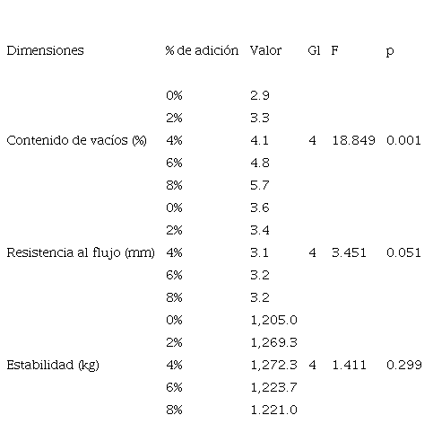 Con respecto al contenido de vacíos de mezclas, asfálticas resultan los siguientes valores: 3.3 %, 4.1 %, 4.8 % y 5.7 % con adiciones de 2.0 %, 4.0 %, 6.0 % y 8.0 % de cáscara de papa calcinada, respectivamente, cumpliéndose con los parámetros requeridos por las normas ASTM, salvo la adición del 8.0 % que es superior al 5.0 % especificado. De esta manera, el mejor valor fue obtenido con la adición de 2.0 % de cáscara de papa con 3.3 ± 0.1 %. Aunado a esto, los resultados estadísticos reflejaron las diferencias significativas existentes en el contenido de vacío entre las distintas adiciones (F = 18.849, p < 0.001).