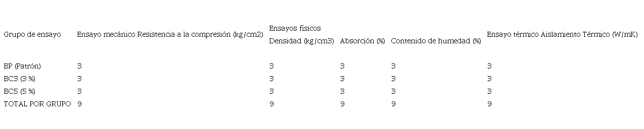 Esta investigación tiene un enfoque cuantitativo, de tipo básico y explicativo, con un diseño experimental, ya que se compararon tres grupos de investigación: un grupo control y dos experimentales con alteraciones en sus componentes al sustituir la arena por 3 % y 5 % de corcho. Se realizaron ensayos de laboratorio estandarizados por las normas técnicas peruanas NTP 399.604 [11], E070 [12] y ASTM C177 [13], correspondientes a absorción, albañilería, flujo de calor y transmisión térmica, respectivamente. Las muestras utilizadas fueron bloques huecos de concreto elaborados de manera artesanal y las cantidades sometidas a cada ensayo se indican en el Cuadro I.