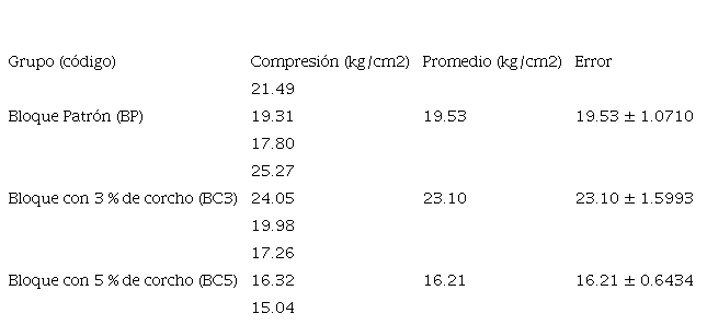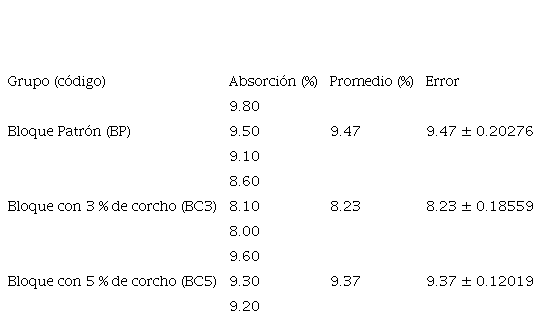 En el Cuadro II, se presentan los resultados de las muestras de cada grupo de investigación y sus valores promedio. Se observa que la adición de 3 % y 5 % de corcho en el bloque de concreto no aumenta la absorción y, por el contrario, la mantiene o disminuye.
