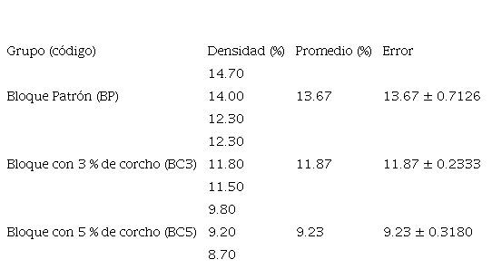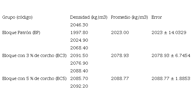 Debido a la hidratación continua del bloque por la retención de humedad en los poros del corcho, se obtuvo una unidad de albañilería más densa. El grupo de control resultó ser el más beneficioso, con un valor de 2023.00 kg/m3. Por lo tanto, el porcentaje más adecuado para su aplicación es de 3 %.