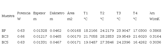 En el Cuadro V, se muestra la tendencia a la disminución de conductividad térmica al aumentar progresivamente el corcho granulado.