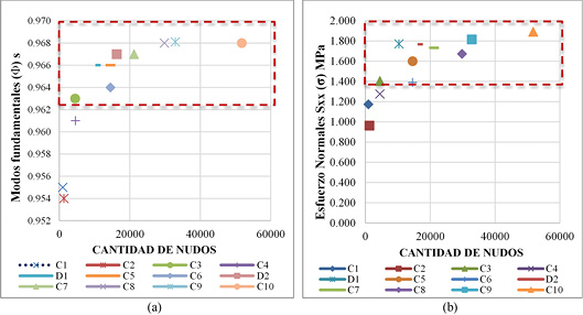 En la Fig. 9, se presentan las respuestas de los modos fundamentales y los esfuerzos normales. Se destaca una zona de convergencia al emplear 4.495 y 51.800 nodos, donde las respuestas muestran una aproximación. Este tipo de mallado fue seleccionado para el modelamiento de la losa de entrepiso como diafragma flexible.