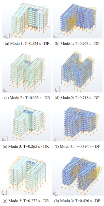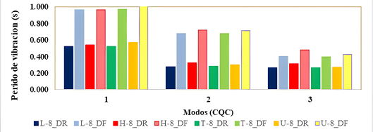 En la Fig. 10, se muestran diferentes periodos de vibración para los modos 1, 2 y 3, en los cuales se aprecia que los modelos con DF obtuvieron los mayores periodos de vibración.