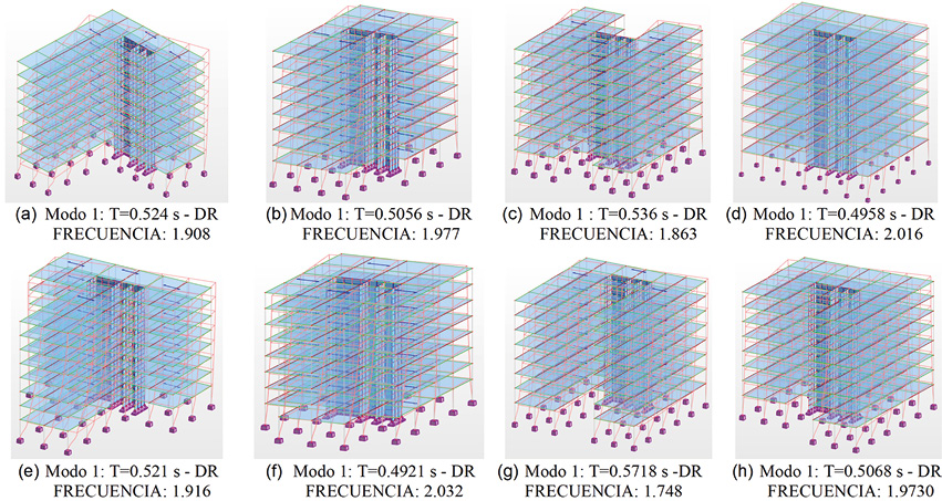 En la Fig. 11, se presenta un resumen de las comparaciones de los periodos de vibración de los tres modos en los casos de estudio. El modelo U_8_DF presentó el periodo fundamental de vibración más elevado. Esta observación se atribuye a la mayor distancia entre el centro de masa (CM) y el centro de rigidez (CR), es decir, obtuvo una excentricidad mayor en comparación con los demás modelos analizados. La influencia directa de esta mayor excentricidad se reflejó en la respuesta dinámica de la estructura, lo cual dio lugar a un periodo de vibración más prolongado.