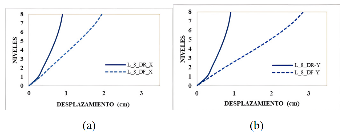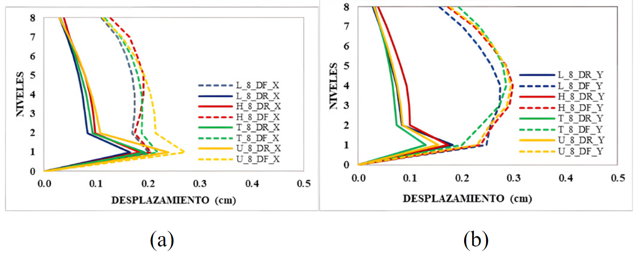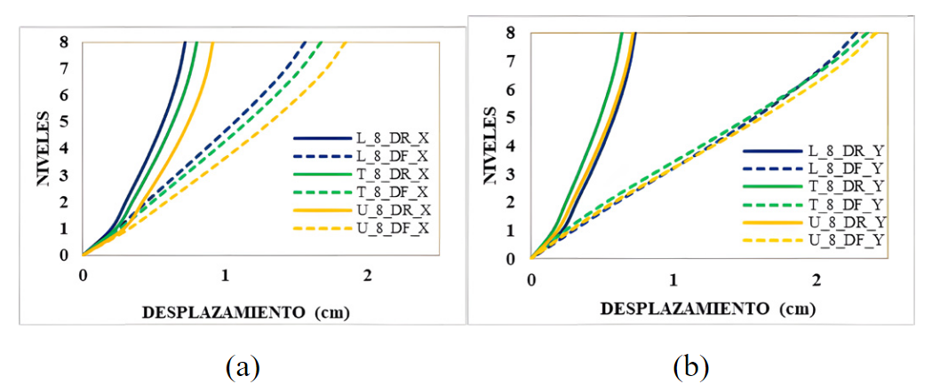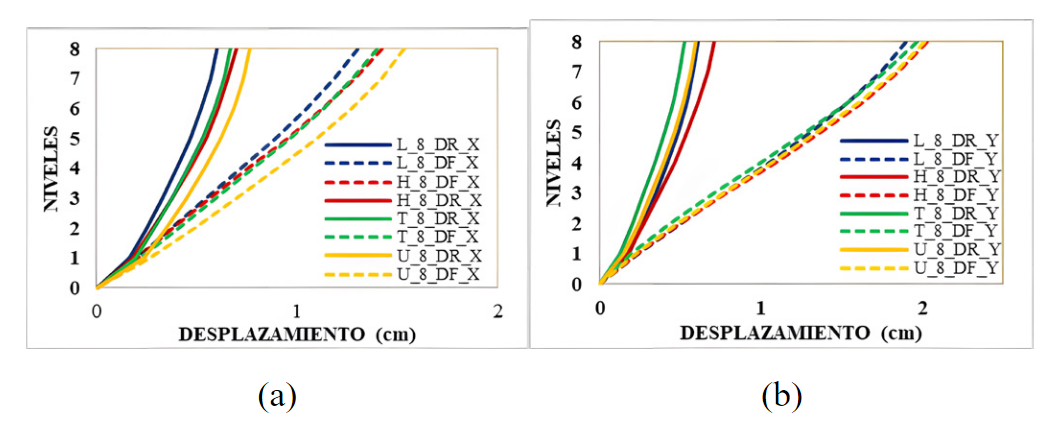 Se consideró el valor de R = 5.4 para evaluar la irregularidad horizontal por esquinas entrantes a todos los casos de estudio. Se determinó que el modelo L_8 presentó mejor comportamiento de los desplazamientos laterales en el octavo nivel en las direcciones de análisis X para casos con DR y DF. Por otro lado, en dirección Y, los modelos T_8 y L_8 obtuvieron menor desplazamiento lateral. Sin embargo, los desplazamientos laterales fueron evaluados en el centro de masa, lo cual no refleja los desplazamientos laterales en los bordes. Las estructuras con irregularidades horizontales requieren evaluar sus desplazamientos laterales en distintos puntos para obtener datos más representativos al aplicar cargas sísmicas. La Fig.13 muestra las respuestas de los desplazamientos laterales en el octavo nivel, en dirección X e Y.