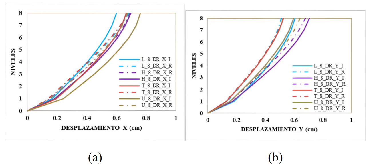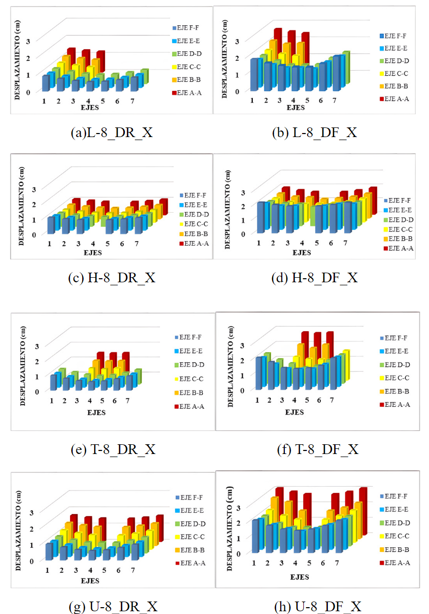 Por otro lado, de las cuatro tipologías analizadas, la figura H tiene un desplazamiento similar en toda la intersección de los ejes, desde del centro de masa hasta los bordes, al aplicar la hipótesis de DR y DF. Al evaluar el desplazamiento lateral, esta tipología ha obtenido el menor valor frente a las demás tipologías. Por lo tanto, para las tipologías L, U y T, es necesario evaluar los desplazamientos laterales en diferentes puntos o intersección de ejes, debido a que el desplazamiento en el centro de masa no representa el comportamiento real de la estructura.