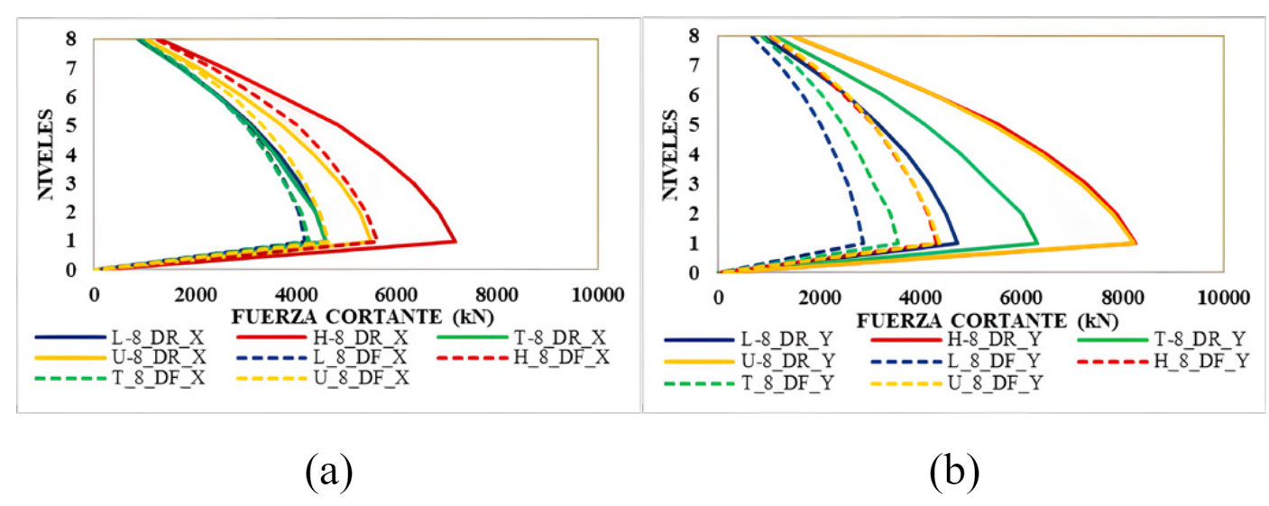 La disminución de las fuerzas cortantes al aplicar la carga sísmica de los casos de estudio con DF se debe a que la losa de entrepiso se deformó en su plano, lo que repercutió en la disminución del coeficiente de amplificación sísmica (C). Los modelos con DR obtuvieron mayor demanda sísmica que los modelos con DF, sobre todo en el primer nivel y va disminuyendo para ambos casos en los niveles superiores. Las configuraciones que presentaron simetría en el sentido de análisis obtuvieron mayores valores de la fuerza cortante. En la Fig. 19, se muestran los resultados de las fuerzas cortantes de los casos de estudio. Además, los modelos H y U presentaron los mayores valores de fuerza cortante en comparación con los modelos L y T, debido a que los casos H y U tienen mayor peso en comparación con los demás casos.
