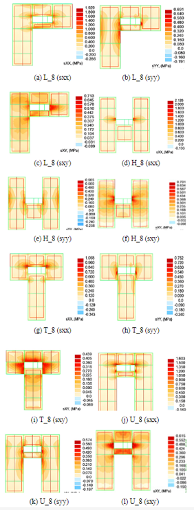 Se obtuvieron respuestas de los esfuerzos normales y de corte en la losa de entrepiso del primer nivel de los casos de estudio con DF. Se aplicó el espectro de diseño amplificado (SMC) para la obtención de las respuestas en dirección X. En los casos de estudio con DF, se observaron que, al aplicar el espectro amplificado, la tipología H presentó mayor valor en los esfuerzos normales (sxx), con 2.13 MPa, la tipología T presentó mayores esfuerzos normales (syy), con 0.75 MPa, y la tipología L presentó mayores esfuerzos de corte (sxy), con 0.71 MPa. En la Fig. 21, se observa que, en el modelo L_8 con DF, los mayores esfuerzos se presentaron en zonas cercanas a las esquinas entrantes y a los muros de concreto armado, que varían en cada nivel.