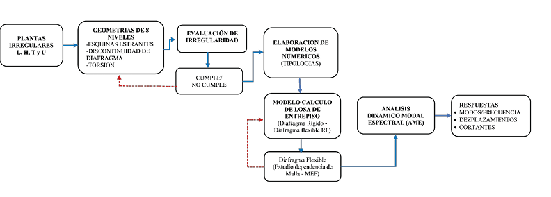 El presente estudio tiene un enfoque cuantitativo con un diseño de investigación no experimental del tipo transversal, explicativa y correlacional, debido a que se evaluó la respuesta lineal de las tipologías considerando el efecto de la irregularidad en plantas tipo L, H, T y U de edificaciones de concreto armado de ocho niveles. Se empleó la metodología del análisis dinámico modal espectral, considerando como carga sísmica el espectro elástico según la Norma Técnica Peruana NTP E.030 [10]. En la Fig. 2, se presenta la metodología empleada para la investigación.