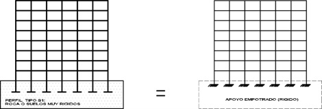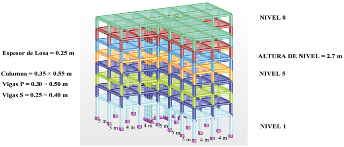 En cuanto a las condiciones de contorno, según la Norma E.030 de Diseño Sismorresistente del Perú , se seleccionó un perfil de tipo de suelo S1, caracterizado como roca o suelos muy rígidos. No se consideró la interacción suelo-estructura para el análisis de respuestas. Para el presente estudio, se estableció un apoyo empotrado (cimentación) para todos los elementos que sostienen la estructura y están en contacto con el suelo (S1), cuya idealización se muestra en la Fig. 4. Así, se consideró una profundidad de un metro por debajo del nivel del terreno para el modelamiento con apoyos empotrados, lo que evita desplazamientos en el plano y giro. Las edificaciones tienen una altura de 21.60 m y están soportadas por una subestructura conformada por zapatas aisladas y combinadas. Se consideró que el comportamiento de los elementos estructurales se encuentra dentro del rango elástico lineal y se asignó una relación de amortiguamiento del 5 % para todos los elementos de la estructura de concreto armado.