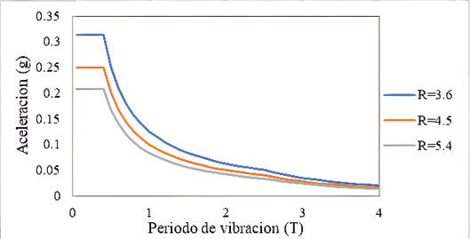 En la Fig. 6, se muestran los espectros de diseño para los casos de estudio. Se consideró R = 5.4 para la irregularidad en planta por esquinas entrantes, R = 4.5 por torsión y el valor de R = 3.6 por torsional extrema.