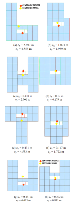En estructuras con configuración irregular en planta, al ser sometidas a fuerzas sísmicas, producen una excentricidad entre el centro de masa (CM ) y el centro de rigidez (CR), lo que conlleva a que no exista una fuerza de resistencia que actúa a través del CR y una fuerza de inercia que actúa a través del CM. En cambio, en estructuras con configuración regular, el CM y el CR coinciden generando mayor estabilidad a la estructura [2]. En la Fig. 7, se presentan modelos con diferentes tipos de irregularidades en planta, que cuentan con áreas iguales y, además, están relacionadas con el CM y el CR. Nótese que, cuando una estructura con configuración en planta es regular, el CM y el CR se aproximan e incluso, dependiendo de la tipología, tienden a coincidir, lo cual genera una menor excentricidad en comparación con estructuras con irregularidad en planta.