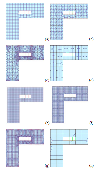 Se elaboraron ocho modelos numéricos con configuraciones de planta tipo L, T, H y U de ocho niveles. Las alturas de las edificaciones fueron consideradas para una zona residencial de densidad media y alta en el departamento de Lima, Perú. Cada nivel tiene una altura de entrepiso de 2.70 m. Se analizaron y evaluaron las tipologías que presentan irrupciones en su geometría en planta, como esquinas entrantes. Además, las plantas con las tipologías mencionadas son formas geométricas que se pueden componer espacial y físicamente en una base reticular de 24 × 25 m. Los casos de estudio corresponden a edificios de concreto armado de mediana altura, conformados por vigas, columnas, losa aligerada y muros estructurales. La vigas y columnas se modelaron como elementos de barra y su conexión como nudos rígidos; mientras que, para las losas y placas, se consideró el modelamiento mediante elementos finitos (MEF). En la Fig. 3, se muestran las características de los modelos numéricos.