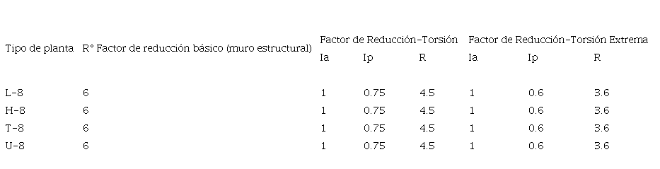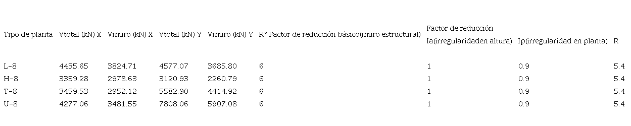El coeficiente de reducción que se consideró para la obtención del espectro de diseño fue multiplicado por el factor de irregularidad en planta, de acuerdo con la NTP E.030 [10], por: esquinas entrantes lp = 0.90, irregularidad torsional lp = 0.75 y por irregularidad torsional extrema lp = 0.60. En el CUADRO VIII, se presentan los valores de la cortante total, cortantes en muros, el factor de reducción básico, factor de reducción por irregularidad en planta y el valor de coeficiente de las fuerzas sísmicas (R).