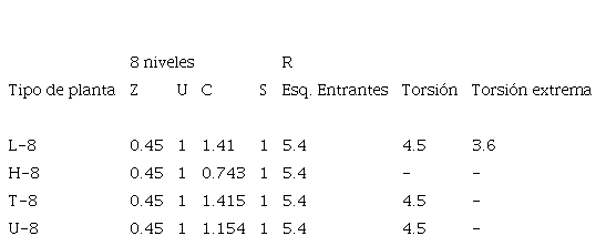 En el CUADRO X, se muestran los parámetros para la obtención del espectro de pseudoaceleraciones de diseño según la NTP E.030[10]. Los parámetros considerados fueron los siguientes: a) zona sísmica (Z = 0.45), se consideró la zona en mención por ser altamente sísmica y para evaluar las respuestas en el perfil de suelo (S1 = 1.0); b) en la categoría de edificación de viviendas multifamiliares (U =1.0); c) para el factor de amplificación sísmica (C), se consideró el periodo fundamental de cada tipología; y, d) para los factores de reducción (R), se consideró la irregularidad por esquinas entrantes, torsión y torsión extrema.