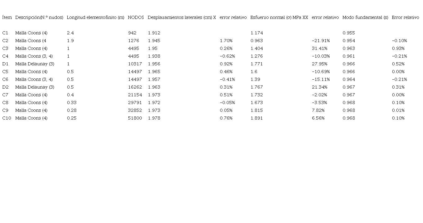 Para el modelo de cálculo de la losa de entrepiso del DF, se llevó a cabo un estudio de dependencia de malla. Se analizaron 10 tipos de mallas con diferentes tamaños de elementos finitos, evaluando las respuestas de los periodos fundamentales, los desplazamientos laterales y los esfuerzos normales. Se buscó la zona de convergencia y la reducción del error relativo de las respuestas al aumentar la cantidad de nodos en los modelos numéricos. En el CUADRO XI, se presentan las respuestas de los modelos numéricos en función del tipo de malla y la cantidad de nodos.