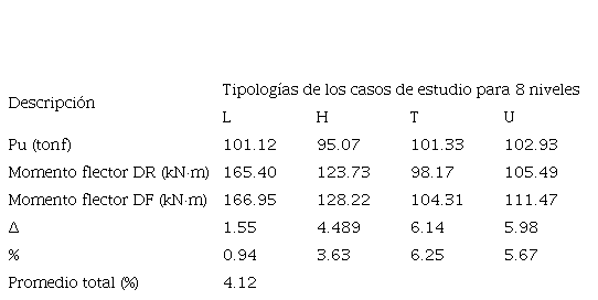 En el Cuadro XIII, se observa la variación de los momentos flectores en columnas del primer nivel, aplicando los modelos con DR y DF. Se obtuvo una variación promedio de 4.12 % de los diferentes casos de estudio. La planta tipo T presentó la mayor variación, con un 6.25%. Los casos de estudio con DF presentaron mayores momentos flectores, por lo que requerirán mayor refuerzo longitudinal en las columnas. La tipología L presentó valores desiguales y elevados a diferencia de la tipología T. Dichos resultados se correlacionan con las asimetrías de los casos de estudio. Al comparar la tipología U y H, presentaron valores más uniformes de los momentos flectores.