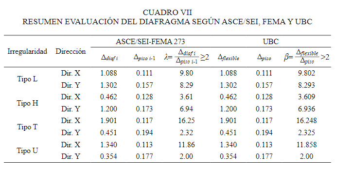Se ha realizado la evaluación de la flexibilidad del diafragma para las tipologías de los casos de estudio. Según FEMA-273, se indica que “para considerar un diafragma flexible, la relación entre la máxima deformación del diafragma y el promedio de derivas es mayor que 2 y para diafragmas rígidos, cuando esa misma relación es menor o igual a 0.5” [27, pp. 3-4]. Además, el código UBC considera que “para evaluar un diafragma flexible la relación entre la deformación máxima de un diafragma es más del doble del promedio del desplazamiento del piso asociado” [28, p. 2-15]. En el CUADRO VII, se observa el valor obtenido de la máxima deformación del diafragma y el promedio de derivas, cuyos resultados varían desde 2.00 hasta 16.25. Según los resultados del CUADRO VII, corresponde a la aplicación de la hipótesis del DF.