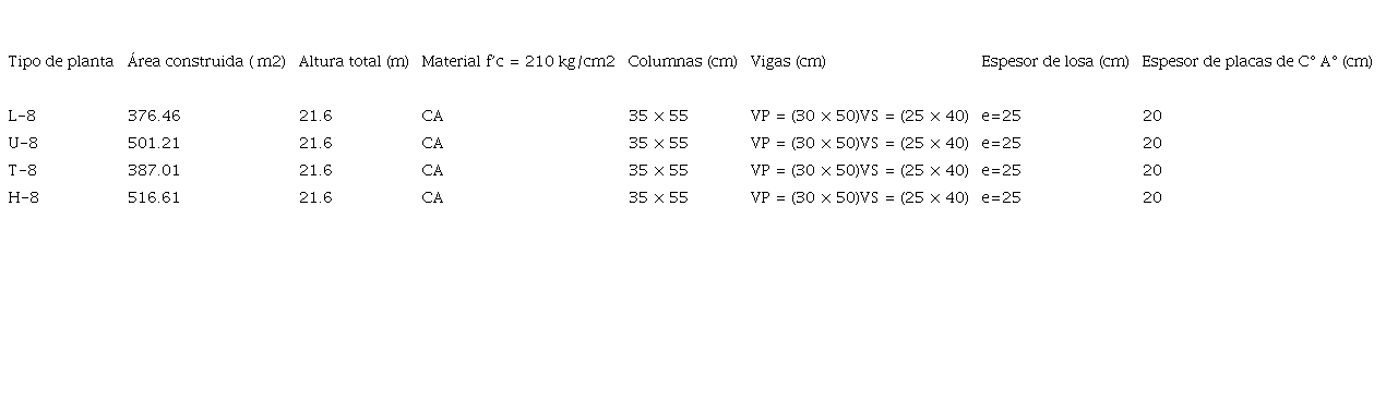 En el CUADRO I, se han definido los parámetros de cada tipología, tales como el área construida, altura total y resistencia del material (f’c). Además, se detallan las características y dimensiones de los elementos estructurales según cada tipología.