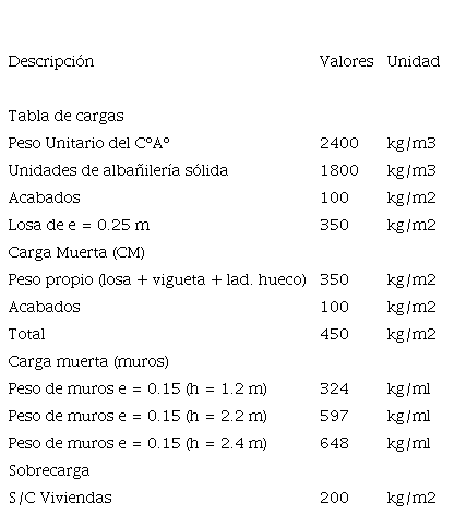 En el CUADRO III , se presentan los valores de las cargas muertas y las sobrecargas que se adoptaron para el análisis estructural. Estos valores se tomaron como referencia de la Norma Técnica Peruana NTP E.020 de cargas[24].