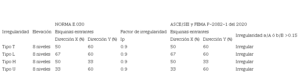 Las edificaciones con diversos tipos de irregularidad en planta se construyen con mucha frecuencia, ya que suelen ser necesarios en el diseño arquitectónico para satisfacer las necesidades funcionales, espaciales y ambientales [1]. Sin embargo, estos edificios con geometrías irregulares en planta presentan desempeños sísmicos más demandantes en comparación con una estructura de edificios con plantas regulares [2], ya que generan excentricidad entre el centro de masa (CM) y el centro de rigidez (CR), lo cual provoca torsión y concentración de los esfuerzos en las esquinas entrantes [3]. Por lo tanto, es importante evaluar y modelar las estructuras de edificios con irregularidad en planta para conocer su capacidad de respuesta frente a eventos sísmicos.