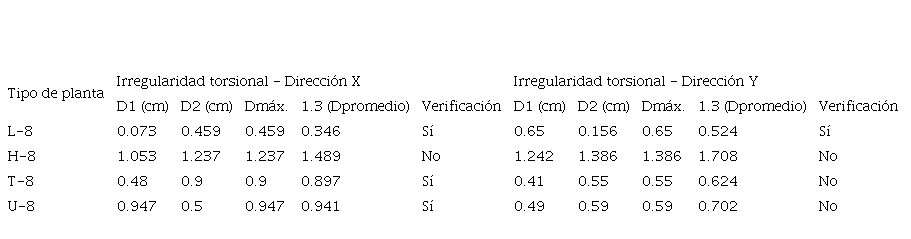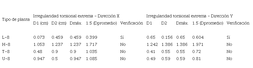 En el CUADRO VI, se muestra la verificación de irregularidad en planta por torsión extrema de los casos de estudio. En el resultado del análisis, se determinó que la tipologia L presentó irregularidad torsional extrema en planta en las direcciones X e Y, según la NTP E0.30 [10].