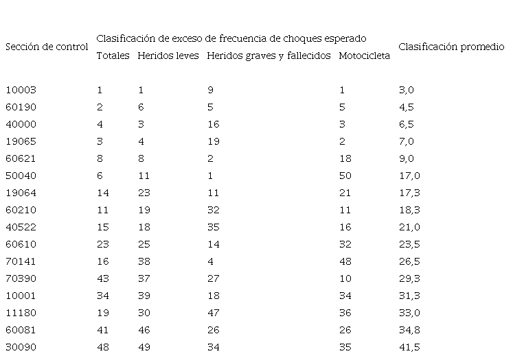 La clasificación promedio se realiza ordenando las secciones de control en orden decreciente, tomando como base el exceso de frecuencia de choques esperado para cada uno de los escenarios de análisis. Luego, se realiza un promedio de estos valores y se muestra en orden decreciente la clasificación promedio de las secciones de control que aparecen en los cuatro modelos analizados.