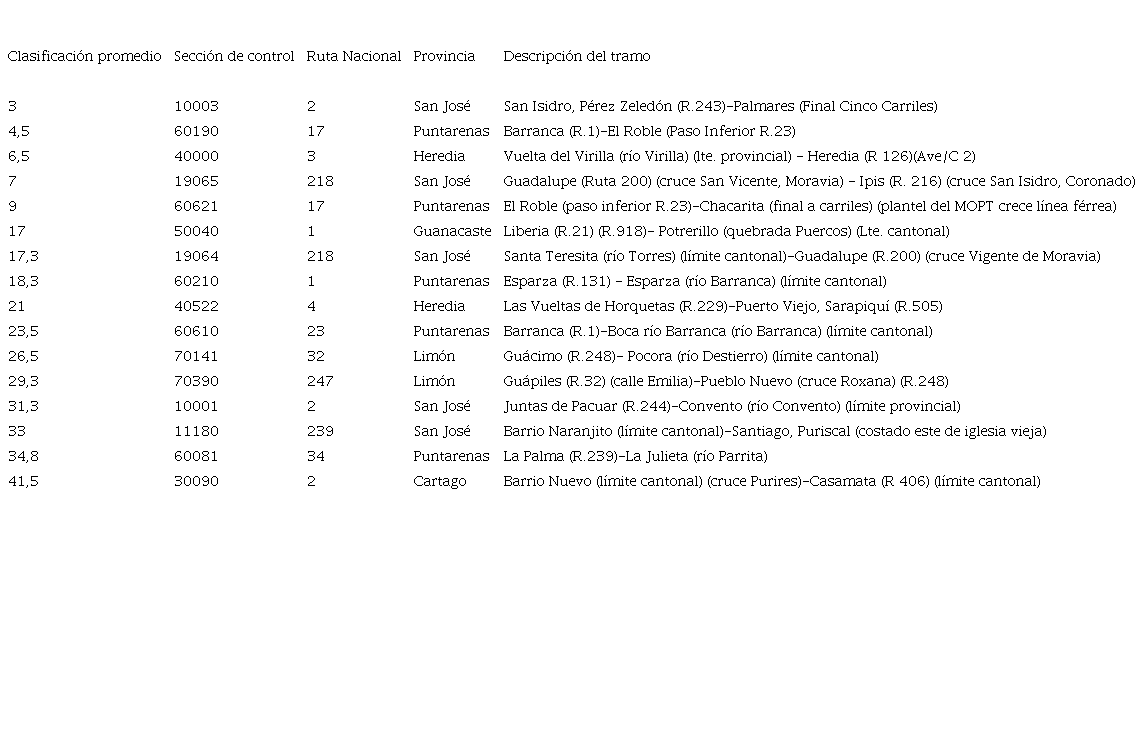 La Secretaría de Planificación Sectorial también facilitó la información de las secciones de control de la RVN de Costa Rica. La base de datos incluía caracterización para un total de 1219 secciones de control.