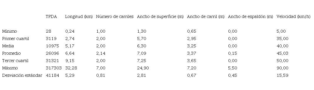 No cuentan con valor de TPDA el 10,78 % de las rutas nacionales primarias, el 15,05 % de las rutas nacionales secundarias y un 42,95 % de las rutas nacionales terciarias. Se excluyeron del estudio aquellas secciones que no tuviesen un valor de TPDA registrado.