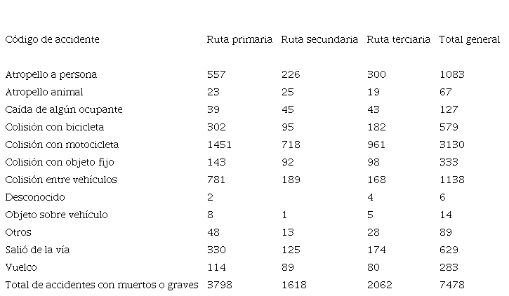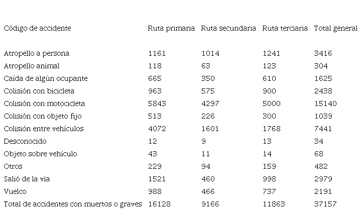 La base de datos suministrada por el Consejo de Seguridad Vial (COSEVI) incluye 44 635 accidentes. De estos, 19 926 ocurrieron en rutas nacionales primarias; 10 784, en rutas de la Red Nacional secundaria; y 13 925, en la Red Vial Nacional terciaria. Del total de accidentes, 7478 corresponden a accidentes con fallecidos o con heridos graves y 37 157, solo con heridos leves. Para ambos casos, destaca la cantidad de colisiones con motociclistas (ver CUADROS II y III).
